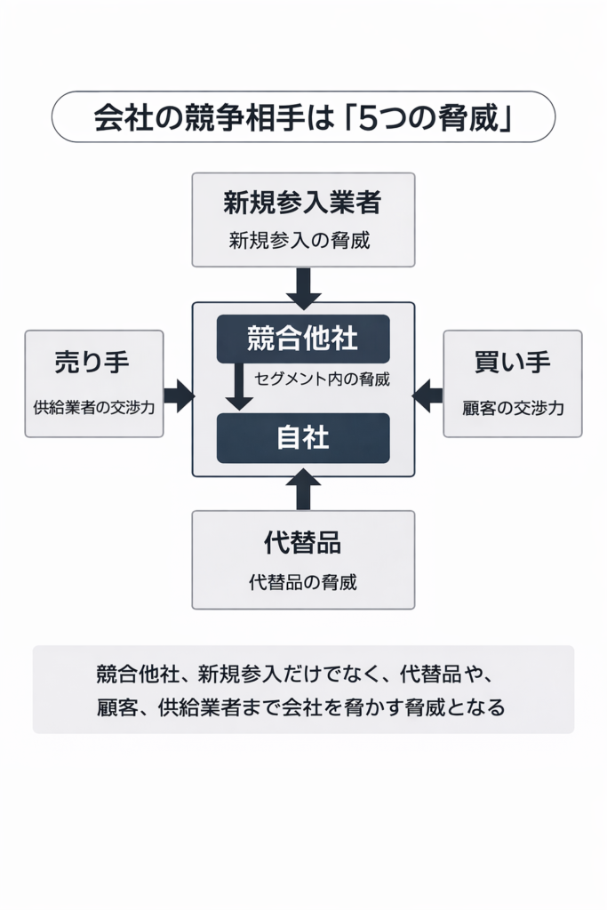 市場には、既存の競合企業だけでなく、新規参入のプレイヤー、代替となる手段、買い手の交渉力、売り手の交渉力といった複数の圧力が存在しています。